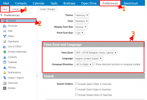 - Đăng nhập vào webmail >> chọn Preferences >> General >> Tùy chọn trong mục Time zone and Language >> Nhấn Save để hoàn tất.