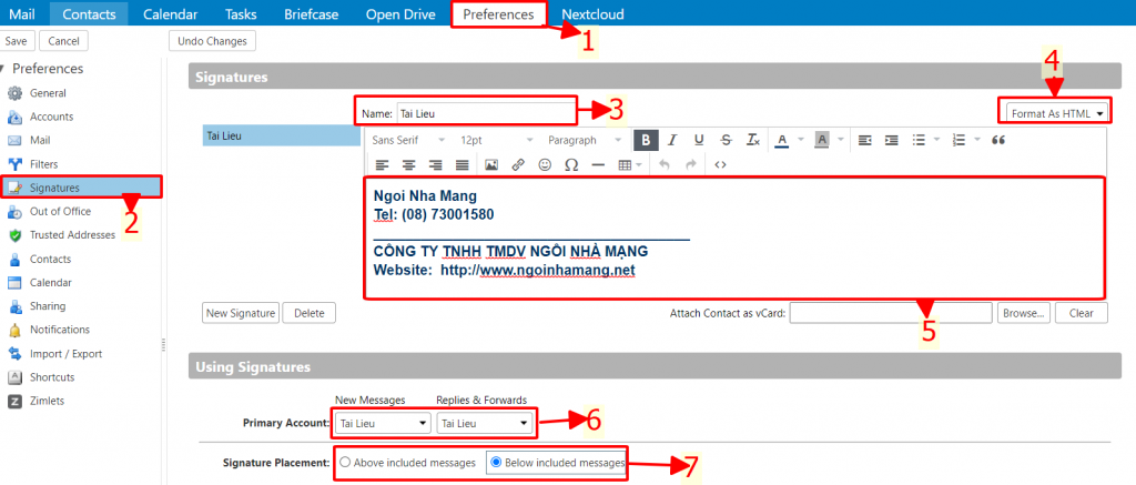 - Đăng nhập vào webmail >> chọn Preferences >> Signatures >> Tạo và định dạng trong mục Signatures